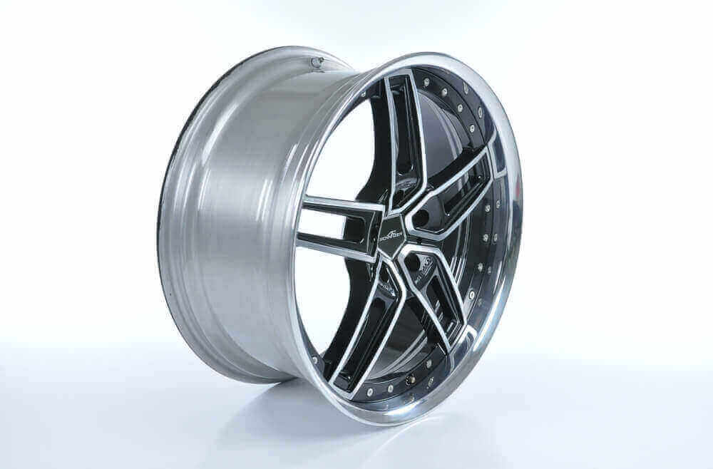 Wheelset development at AC Schnitzer A few definitions in advance Wheel/complete wheel = rim incl. tyre Wheel set = 4 wheels xi/xd wheel sets = special wheel sets for all-wheel drive vehicles (xDrive) Mixed-sized tyres = tyres wider on the rear axle than on the front axle All-round tyres = same tyre size on the front and the rear axle The wheels have a really important role: they are the postcard-sized connection between the vehicle and the road. They play a key role in the driving and propulsion as well as the deceleration – i.e. braking – of your vehicle. This gives the wheels a key role. Anyone who develops and sells wheels therefore has a great responsibility. We are aware of this responsibility; we have internalized it and implement it with every new development. AC Schnitzer only uses high-quality brand tyres, which are developed in close cooperation with premium tyre manufacturers. On the one hand, the tyres have to transfer the power of the engine perfectly to the road, on the other hand, properties such as braking behaviour, lateral control, water drainage in rain and the properties in straight running are important decision criteria for or against a tyre. A wheel set with wide base tyres is always also an investment in increasing driving safety and dynamics. In order to maintain driving comfort when using larger wheel dimensions, we at AC Schnitzer have actively opted against run-flat tyres and for sporty, conventional tyres. Conventional tires build up less rolling resistance and offer noticeably more comfort. AC Schnitzer specialises in mixed-sized tyres, i.e. wheel sets in which the wheels of the rear axle are wider than those of the front axle. This makes sense in terms of driving dynamics, as it allows strong drive forces to be transmitted while at the same time enabling high steering precision. Although the wider a tyre is, the more power you can put on the road, the rolling resistance caused by the tyre must not become too high. As the rolling resistance increases the wider a tyre is, AC Schnitzer works out the wheel dimensions that are balanced. AC Schnitzer develops special wheel/tyre combinations for all-wheel drive vehicles and orientates itself on the specifications of the vehicle manufacturer. These AC Schnitzer wheel sets are marked “xi/xd”. Only those wheel dimensions are developed and approved for all-wheel drive vehicles that are as gentle on transfer cases as standard wheel sets. All AC Schnitzer wheel sets are tuned in multi-stage driving tests in traffic and on race tracks. Only after successful test runs the wheels are released for sale. All AC Schnitzer wheel sets are delivered fully assembled and balanced. They are subject to a two-year manufacturer’s warranty. The scope of delivery includes mounting materials such as adapters and wheel bolts as well as the homologation certificate (with the exception of marked wheelsets for export). Philosophy/Design Technical and Visual Revolution: Forged Racing Wheel Type VIII from AC Schnitzer If light alloy wheels consist of more than one component, they are referred to as multi-piece light alloy wheels. Three-piece AC Schnitzer alloy wheels consist of two rim halves and the wheel star. The Forged Racing Wheel Type VIII is based on the design of the Type VI wheel but has even more to offer. The genuine three-piece designer product is a revolution in the broad marketplace for popular spoked wheels, and complements perfectly the styling language of BMW. The visual charm of the rim with its classic 5 double-spoke design comes from the cast, forged and machined inner star and a spoke frame held in anthracite. The visible bolted connections to the wheel bed are a deliberate visual highlight. At the same time, the stainless steel bolts confirm the multipiece nature and hence the exclusivity of the wheel. The outer and inner rim beds consist of flow-formed forged metal. Despite the wealth of detail, the multipiece Forged Racing Wheel Type VIII does not look busy, but the simple lines give it a masculine, athletic appearance. – 3-piece rim – Visible bolted connection with stainless steel screws – Outer bed: forged, milled, rolled and clear lacquered – Inner star: forged, milled and black painted – Surface turned, clear lacquered – Inner bed: aluminium block, milled, rolled and Anthracite anodized – weight reduction through forging technology – reduction in unsprung mass and gyroscopic forces on the car, therefore – improved driving dynamics – better acceleration and deceleration due to lower masses – improved cornering handling – striking, slim design in Anthracite and Silver – high quality clear lacquer protects the wheel against corrosion, therefore – long life – exclusive appearance of the Racing Forged rims Material Inner star: Forged block of high-strength aluminium Outer bed: High-strength aluminium Inner bed: high-strength aluminium Manufacture Steps on the way to perfection Inner star forged Outer bed deep-drawn, CNC-machined, high-gloss polished and clear lacquered Inner bed deep-drawn, CNC-machined, anodized The individual components are connected to each other with high-strength titanium screws. Surface BiColor Anthracite/Silver In this process, the wheel is first primed, then completely painted. Now the AC Schnitzer and Forged logos as well as various detail areas, which are later to shine metallically bright, are milled. A two-layer clear coat is then applied, consisting of a polyester primer and the matt acrylic clear coat. Outer bed / surface In this process, the outer bed is first polished to a high gloss. A two-layer clear coat is then applied, consisting of a polyester primer and the glossy acrylic clear coat. Inner bed / Surface In this process the inner bed is anodized Test Procedures / Safety After their design, the first sample rims are manufactured under real production conditions. These must undergo a multitude of tests. Among other things, the strength is teste