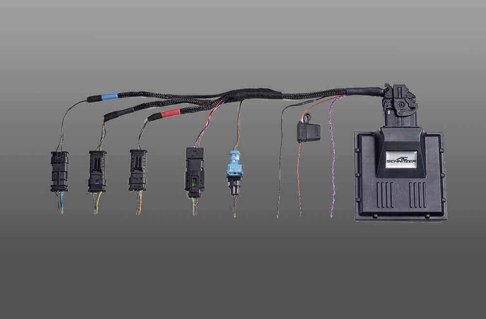 The performance upgrade consists of a control unit for retrofitting into the vehicle. The control unit ensures that the data is processed depending on the speed and accelerator pedal position and the values for boost pressure, track pressure and air mass are passed on to the standard engine control unit. The parameters are slightly increased by the AC Schnitzer performance increase.