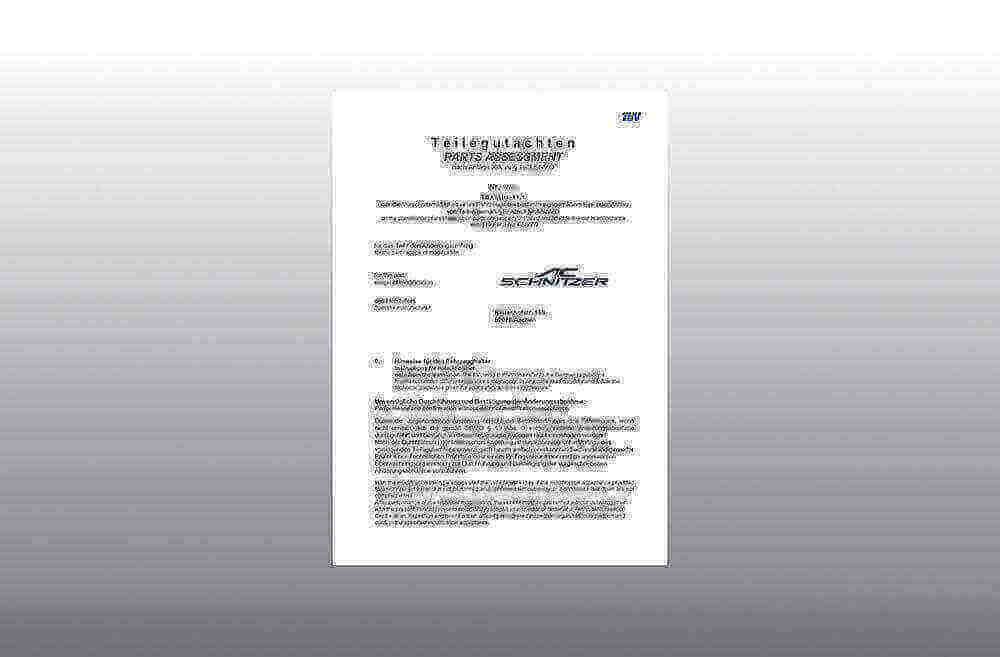 The parts homologation certificate is an official document which allows the use of tuning parts in public road traffic within the framework of the (StVZO) German road traffic licensing regulations (and some other countries). After installation or conversion of the part described in the certificate, the vehicle must be presented to an official inspection body. The inspector determines the correct installation and the authenticity of the part and subsequently enters the modification in the vehicle documents. The official operating license of the vehicle thus remains in force. The parts homologation certificate is part of the scope of delivery.