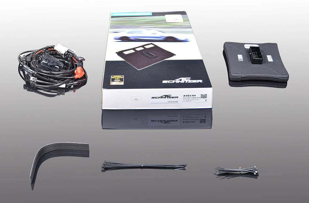 The performance upgrade consists of a control unit for retrofitting into the vehicle. The control unit ensures that the data is processed depending on the speed and accelerator pedal position and the values for boost pressure, track pressure and air mass are passed on to the standard engine control unit. The parameters are slightly increased by the AC Schnitzer performance increase.