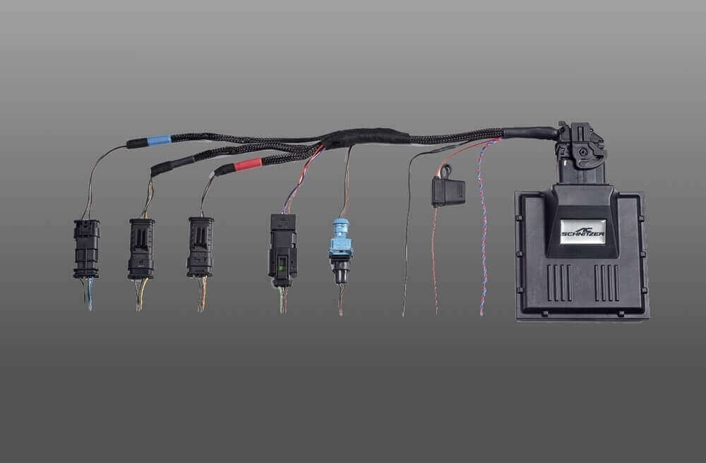 The performance upgrade consists of a control unit for retrofitting into the vehicle. The control unit ensures that the data is processed depending on the speed and accelerator pedal position and the values for boost pressure, track pressure and air mass are passed on to the standard engine control unit. The parameters are slightly increased by the AC Schnitzer performance increase.
