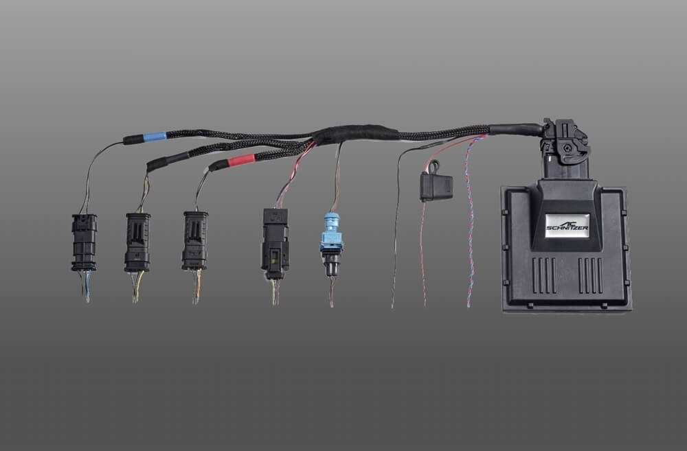 The performance upgrade consists of a control unit for retrofitting into the vehicle. The control unit ensures that the data is processed depending on the speed and accelerator pedal position and the values for boost pressure, track pressure and air mass are passed on to the standard engine control unit. The parameters are slightly increased by the AC Schnitzer performance increase.