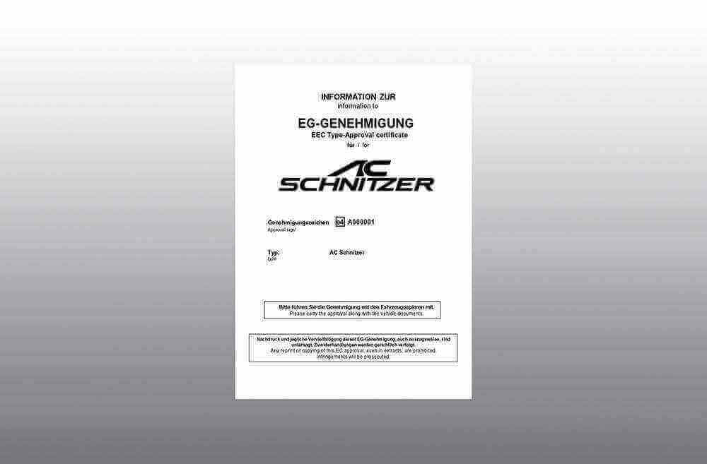 You can mount this item individually or in combination with an AC Schnitzer performance upgrade. Homologations for this area of application are available and are supplied with the product.
