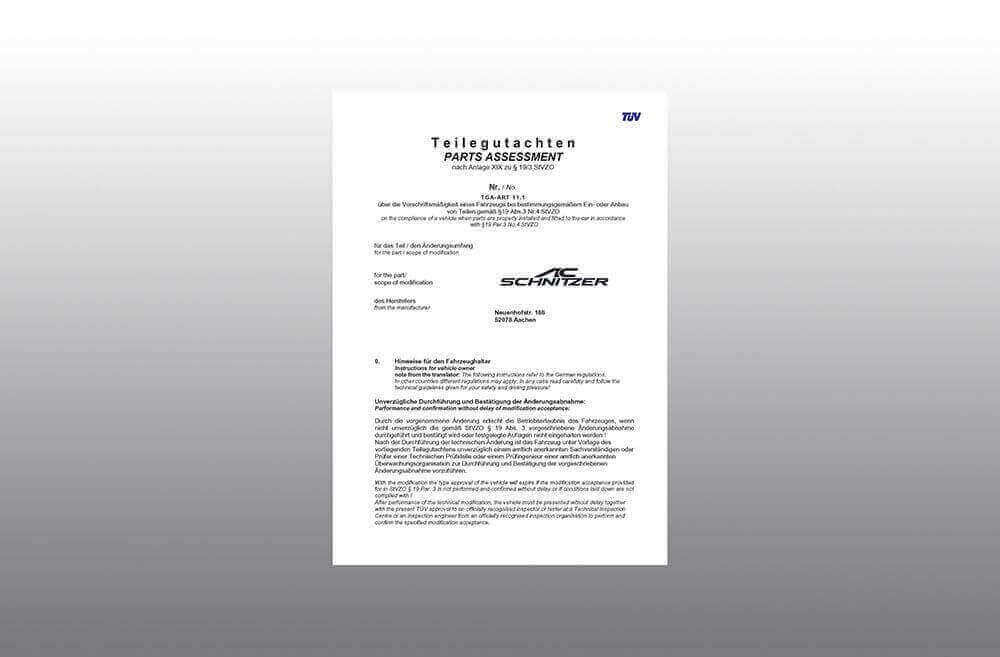 The parts homologation certificate is an official document which allows the use of tuning parts in public road traffic within the framework of the (StVZO) German road traffic licensing regulations (and some other countries). After installation or conversion of the part described in the certificate, the vehicle must be presented to an official inspection body. The inspector determines the correct installation and the authenticity of the part and subsequently enters the modification in the vehicle documents. The official operating license of the vehicle thus remains in force. The parts homologation certificate is part of the scope of delivery.