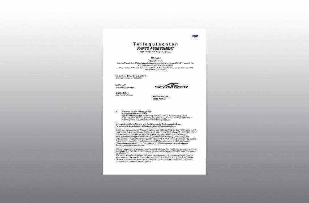 The parts homologation certificate is an official document which allows the use of tuning parts in public road traffic within the framework of the (StVZO) German road traffic licensing regulations (and some other countries). After installation or conversion of the part described in the certificate, the vehicle must be presented to an official inspection body. The inspector determines the correct installation and the authenticity of the part and subsequently enters the modification in the vehicle documents. The official operating license of the vehicle thus remains in force. The parts homologation certificate is part of the scope of delivery.